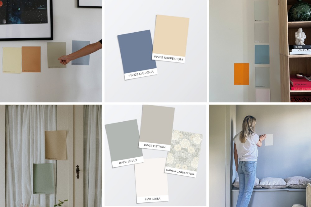Du kan kjøpe maling og tapetprøver på alle våre stiler og stilforslag. Fargeprøvene er håndmalte på selvklebende dekalpapir. Utrolig enkel å flytte rundt, slik at du virkelig kan se sluttresultatet. Du kan kjøpe individuelle fargeprøver, fargeprøver av en hel palett eller fargeprøver av et ferdig fargesett.
